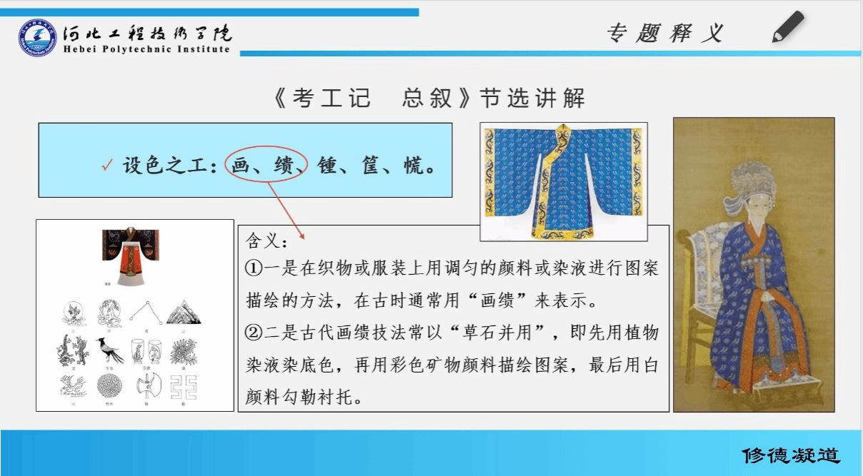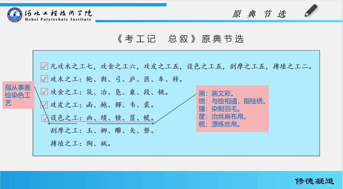 《中国古代设计文献选讲》微课用信息化手段将讲课内容进行了处理,设置了原典节选、专题释义、延伸阅读以及多媒体学习资源,共三个教学板块,教学内容丰富,理论知识联系实际操作工艺,培养了学生的专业素质,提升了艺术设计理论的水平,特别是培养了学生的思考分析能力,使学生能将所学知识和工艺方法运用在自己的设计作品上以提升创造水平,为今后从事艺术类、设计类的工作与研究打下良好的基础。在当今设计教育蓬勃发展之际,我国博大精深、富于艺术与技术启发性的古代设计思想,有待于我们的“回头看”,有待于我们的共同关注,有待于我们的一同挖掘和弘扬!