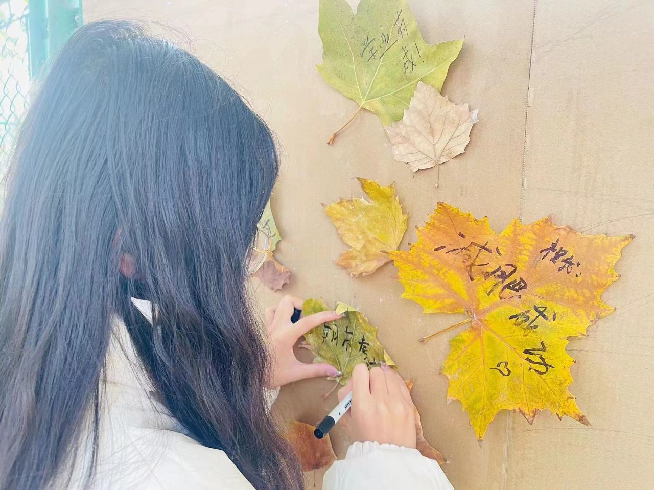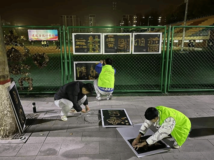 落叶之秋,微风徐来,所有美好,不期而至。活动前期,经过对学院同学们投稿方案的层层筛选,确定下来造型方案和创意省份代表字方案并开始制作,本次省份创意代表字的制作由21个小组在操场北面铁丝网进行,从早上八点到晚上十点,同学们把落叶摆成各种省份的简称,并且装饰在铁丝网上,志愿者们对设计小组的后勤保障,帮助粘贴落叶小作品,以及帮落叶不足的小组收集落叶,正因为有同学们的共同努力,才使得这次的落叶创意文化节顺利进行。