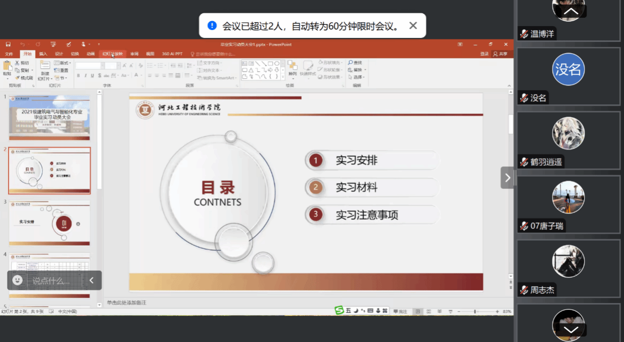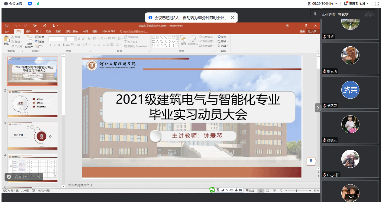 本次会议利用腾讯会议的形式在线上召开,首先由钟爱琴老师介绍了毕业实习安排,围绕实习要求和注意事项进行了全面解读。钟老师向学生们强调了毕业实习的重要性,并要求学生们要加强技能锻炼,树立安全意识、纪律意识和劳动意识。同时,指导老师们还强调了遵守实习单位规章制度的重要性,并鼓励学生们发扬不怕苦、不怕累的精神,以饱满的热情投入到实习工作中,按要求认真完成实习的各项任务,通过这次毕业实习的机会来磨练自己,提升自身的综合能力。