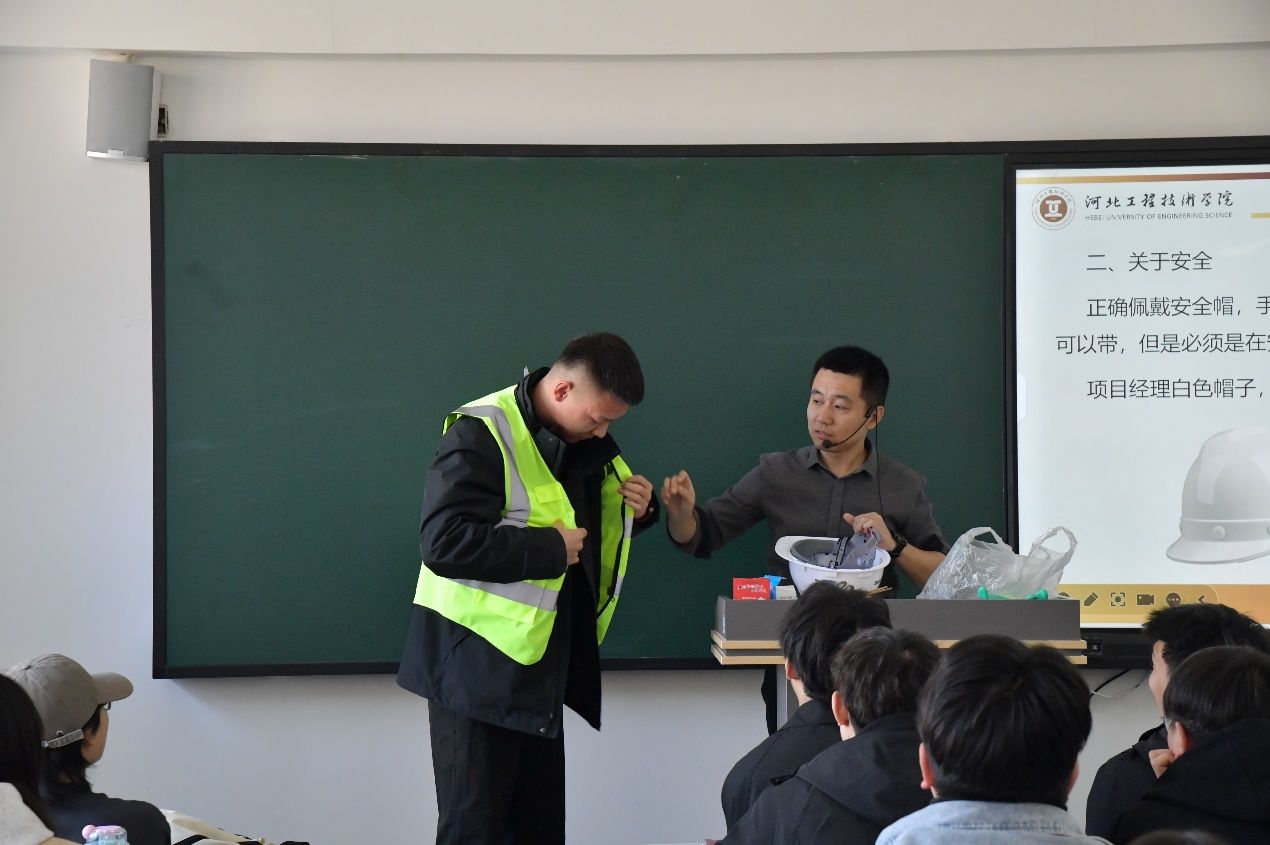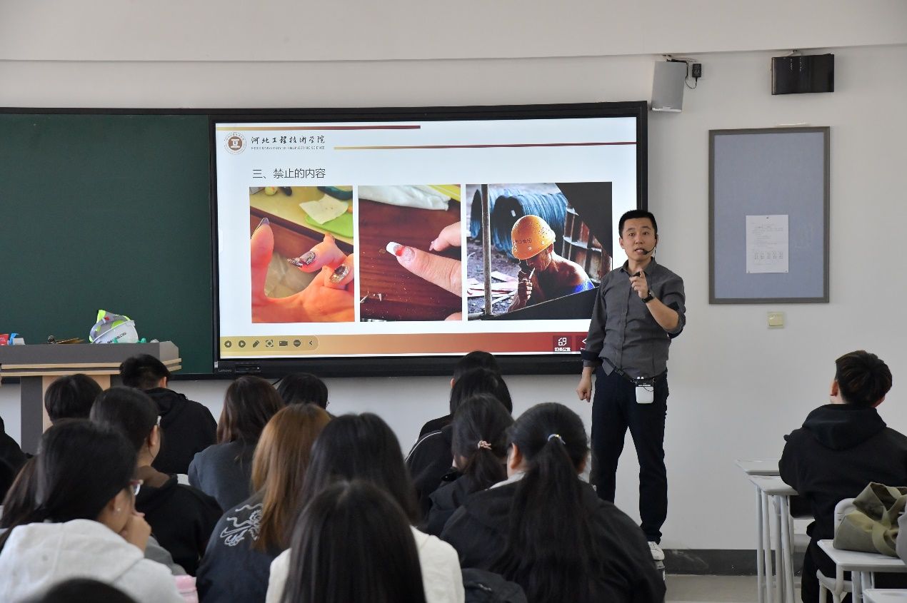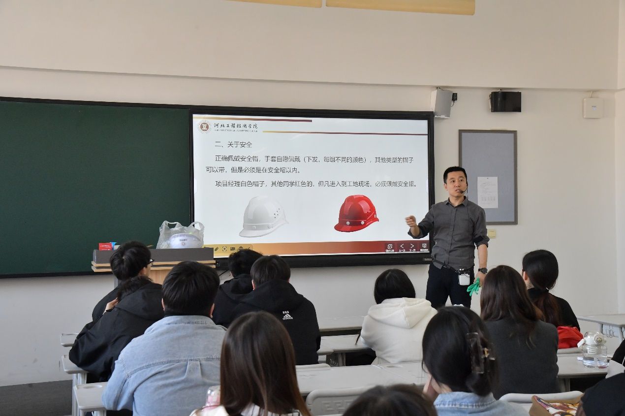 会上,李老师介绍了实习环境的特色,并详细地介绍了施工现场的基本情况。他特别强调了实习期间安全问题的至关重要性,通过引用实际案例,深入浅出地剖析了可能存在的安全隐患,提醒学生们要时刻保持高度的警惕性。在安全教育环节,李老师重点讲解了正确佩戴安全帽对的重要性。他展示了不同类型的安全帽,详细阐述了项目经理与普通员工安全帽的颜色区别,并再次强调了进入施工现场必须佩戴安全帽的硬性规定。随后,李老师还亲自演示了如何正确佩戴安全帽,确保学生们在实习期间能够熟练掌握这一安全技能。此外,大会还明确指出了实习期间的禁止行为。李老师通过展示一系列相关图片,直观地向学生们传达了施工现场禁止携带打火机等易燃物品,以及严禁吸烟等规定。旨在全方位保障学生的人身安全,有效预防安全事故的发生。