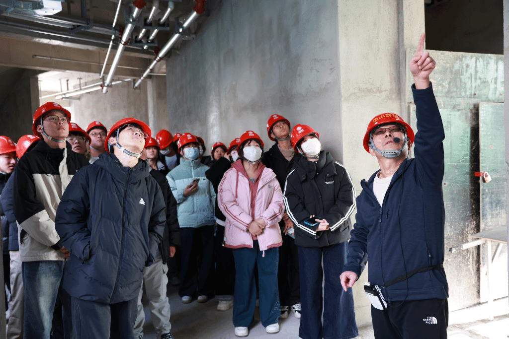 实习课程精心设计了工程现场实践环节,组织师生赴正定县塔元庄学校项目实地研学。在项目现场,施工单位河北恒山建筑工程有限责任公司白经理与监理单位华腾鸿业项目管理有限公司技术总工梁总为同学们进行了专业讲解。该项目创新性地融合了两种先进建造技术:幼儿园部分采用国际领先的被动式超低能耗建筑技术,通过高效保温系统、气密性构造和热回收装置,实现了"四恒"(恒温、恒氧、恒净、恒静)的绿色健康环境;小学部分则运用装配式建筑技术,预制构件工厂化生产、现场模块化组装,较传统工艺缩短工期30%以上,显著提升建造效率。同学们通过实地观摩智能建造技术的工程应用,对现代建筑工业化发展有了更深刻的理解。