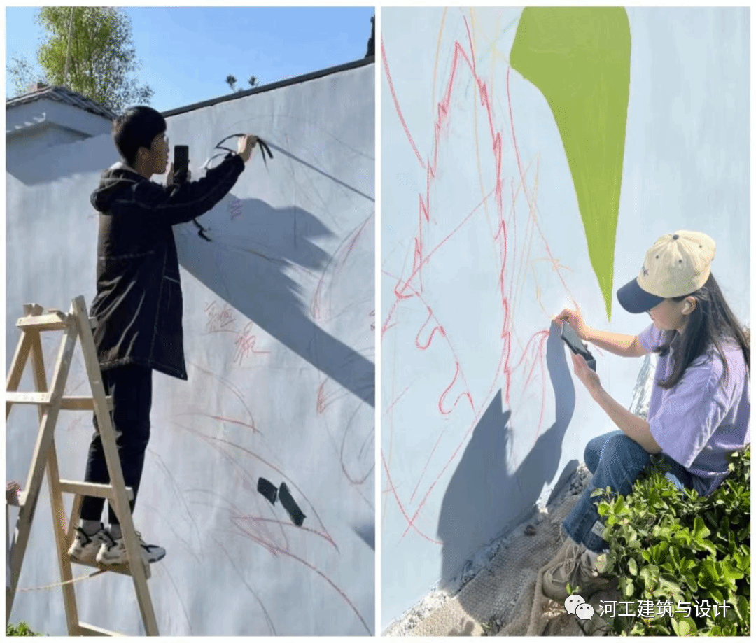 同学们在墙上描绘环境中的点点绿色;感受生活中的健康向上;