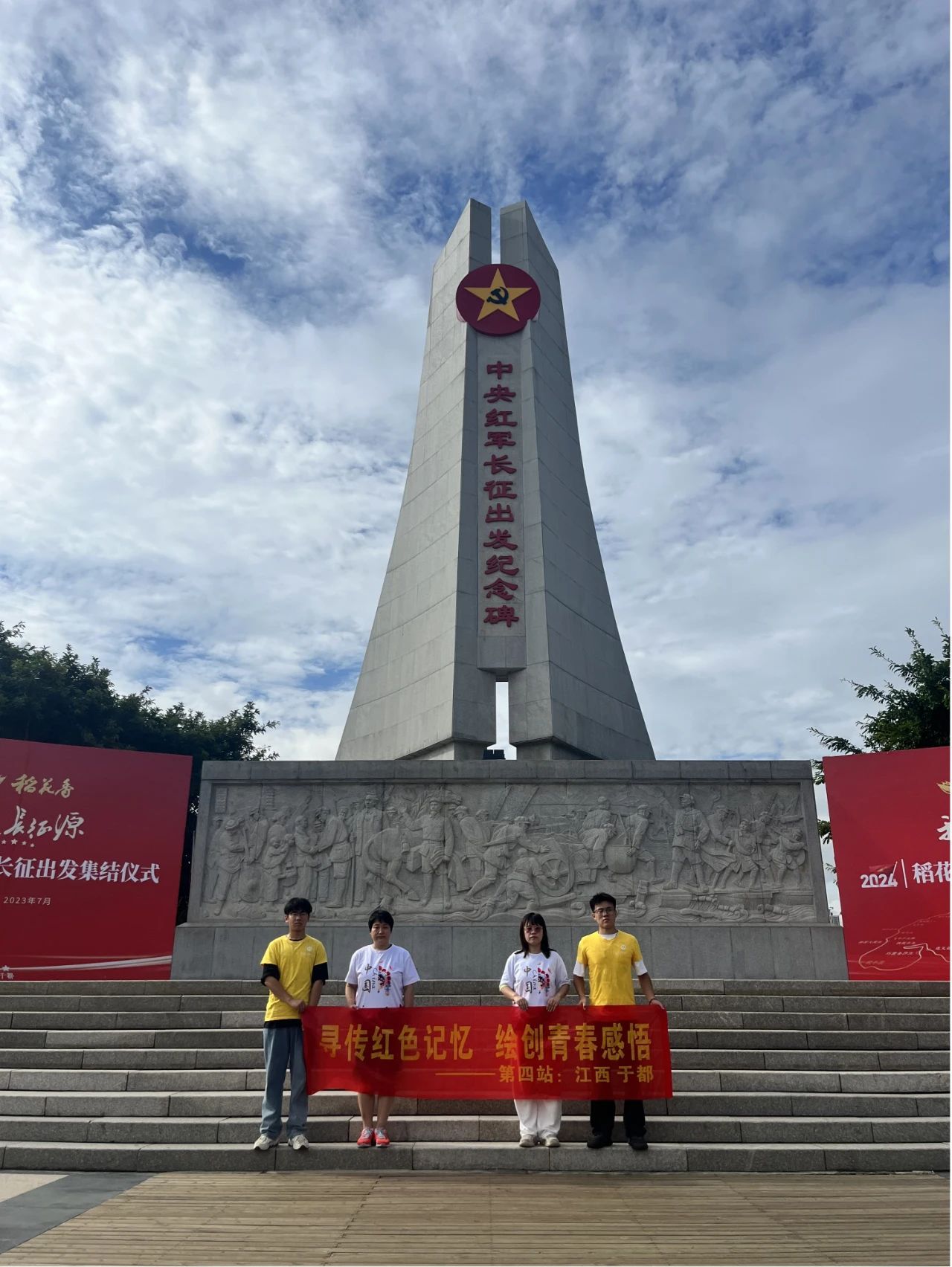 第一站,红色走读实践队来到“长征第一渡”和中央红军长征出发纪念碑。队员们漫步在长征渡口,眺望于都河,回望曾发生在这里的波澜壮阔的历史故事。队员们查阅资料结合当地百姓讲述了解到,在1934年10月,于都河北岸集结着中央红军主力五个军团及中央、军委机关和直属部队8.6万余人,此时的外围,敌军重兵正围追堵截,步步紧逼,当地百姓主动送来门板、床板,甚至寿材,几乎家中所有可用的木料都用来搭设了浮桥,通过8个主要渡口、5座浮桥,红军渡过于都河,踏上了漫漫征途。站在渡口抚昔追今,队员们无一不感慨万千。