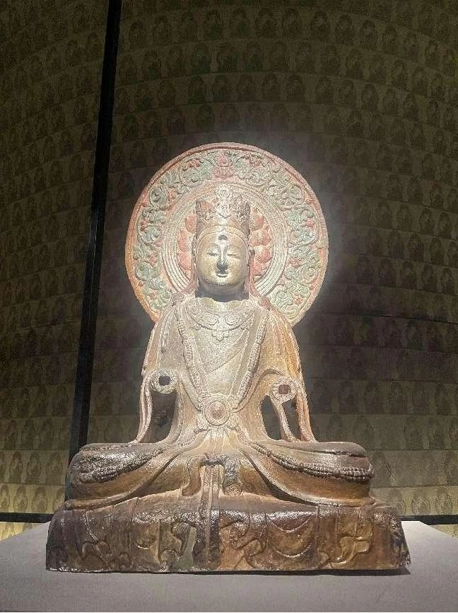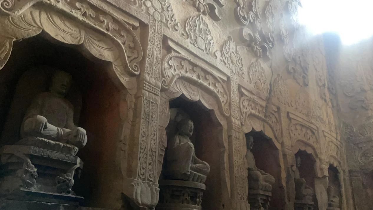 顶着烈日寻古,来到了石窟的北洞,当进入石窟的瞬问,极为震撼,北洞被称为“大佛洞”,是响堂山石窟群当中开凿最早的洞窟。大佛洞的设计融合了佛教宇宙观中独特的时间与空间观念。石窟入口处经过重修,入口上方是三个透光明窗,入口顶部还有类似覆钵顶的痕迹。洞窟内部设有大型的方形中心柱,柱上雕刻代表过去、现在和未来的三世佛,每尊佛两侧立有胁侍菩萨。国绕中心桂四周的石壁上和中心柱顶部刻开小龛,雕凿佛、菩萨和其他神祗,包括飞天和鬼神,这些高浮雕刀法精湛,刻画如生。石刻的造型工艺十分精妙,人物造像、光背火焰、以及由山花蕉叶、摩尼宝珠和装饰图案所围绕的覆钵顶塔形龛,体现了高超的雕刻技术水平。桑梓团队参观考察中及时记录了响堂山石窟中有特色的文化艺术元素,方便为后期设计文创产品提供灵感。通过此次调研考察,桑梓团队不仅收获了丰富的创作灵感,更能够切身体会佛教圣地信仰与艺术结合千年的结晶的魅力。