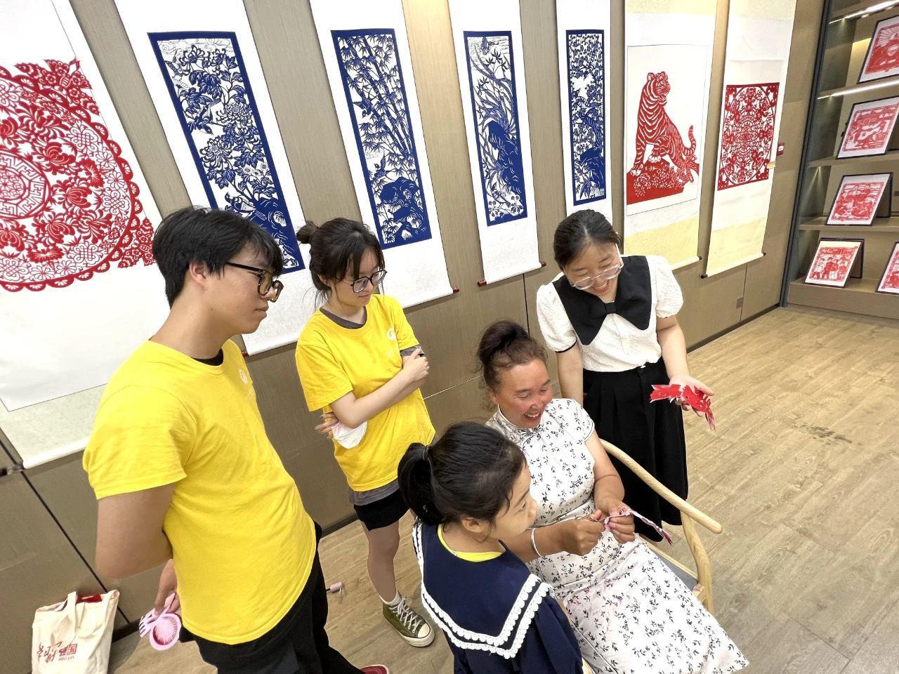 在吕梁的最后一程我们有幸联系到兴县剪纸非遗传承人李去平老师,并受邀去到她的工作室参观学习;李老师9岁开始跟奶奶学习剪纸,13岁开始创作,目前在兴县五所学校任剪纸老师,参加省级国家级剪纸比赛多次获奖,中国剪纸委员会委员,去工作室的路上,她热情的为我们介绍兴县的红色历史,还讲述了她与剪纸的不解之缘;打开剪纸基地的竹帘,实践队员无一不被眼前的场景震撼,很难想象这一幅幅精美的剪纸作品是出自这样一位年过六旬的老人手中,随后李老师逐一为我们介绍她的作品,说话间还为我们每位实践队员剪了一张小礼物,从言语和动作中我深刻的感受到李去平老师对剪纸艺术的热爱和想把非遗技术传承下去的决心,她动情对实践队员说到:现在社会好了,你们青年人一定要多学一点本领,要把老一辈人的“财富”学进手里。