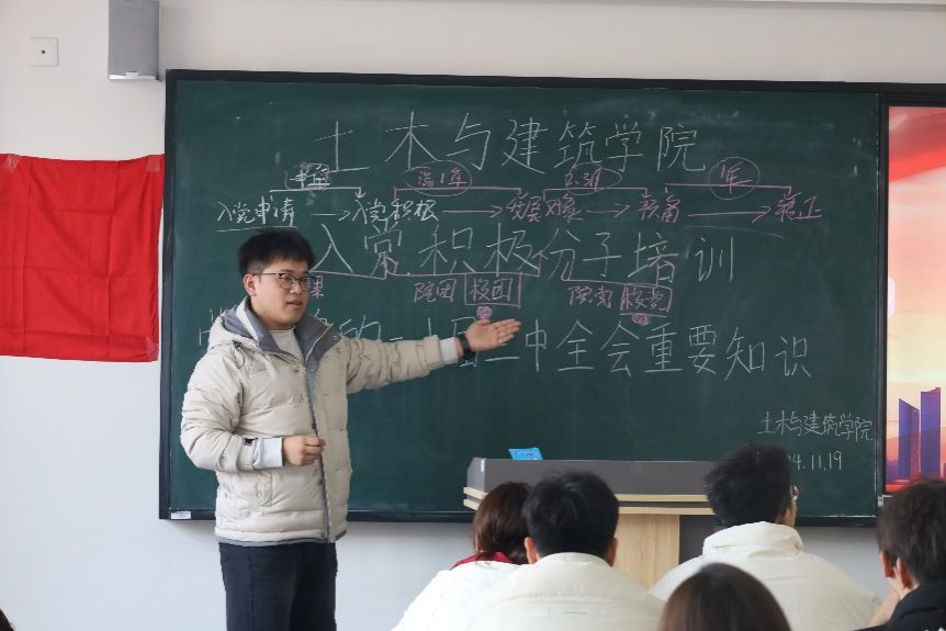 “逢山开路,遇水架桥”“艰难困苦,玉汝于成”“勇立潮头,奋勇搏击”,党的二十届三中全会再次传递出“改革不停顿、开放不止步”的鲜明信号,吹响了新起点上进一步全面深化改革的号角。2024年11月19日,beat365唯一官方网站在主教501开展了“学习党的二十届三中全会重要知识”主题培训,主讲人为宋佳运同学。
