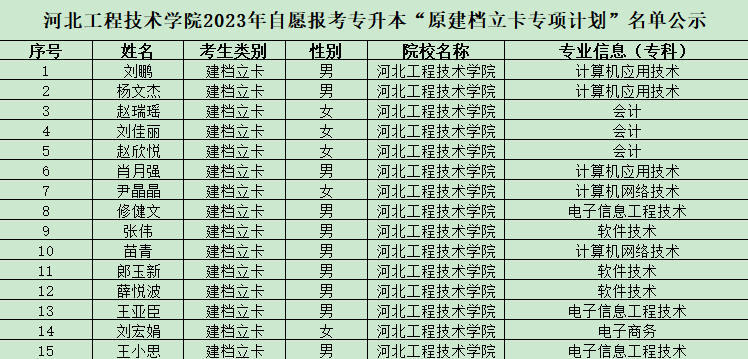 根据河北省教育考试院关于印发《2023年河北省普通高等学校专升本考试招生实施办法》的通知(冀招委办〔2023〕1号),beat365官网对“建档立卡”相关报名材料进行了资格审核,现将自愿报考专升本“建档立卡专项计划”的考生名单予以公示。