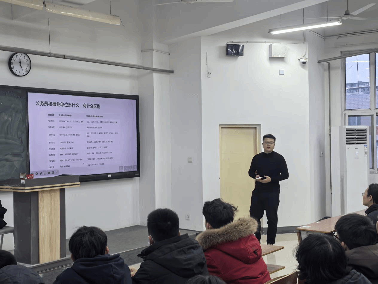 讲座伊始,刘宏毅老师以“政策解读+趋势分析”为切入点,详细梳理了国考与省考的考试形式差异:从笔试科目(行测、申论)的题型结构,到面试环节的考察重点,再到报考条件中的专业限制、学历要求等核心政策要点,均进行了深入浅出的解析。他特别强调,近年公考岗位对专业匹配度要求提升,建议同学们提前梳理自身优势,结合土木建筑类专业的就业方向做好岗位筛选预案。
