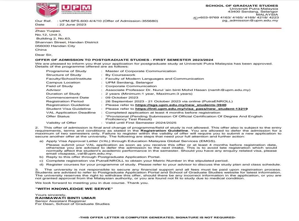 在后来的大学生活中,我认真完成本科课程学习的同时,有空就会泡在图书馆,一呆就是一天,从图书馆开馆学习到闭馆。虽然学习的过程十分枯燥,但十分充实,并且当时正值疫情期间,在精神和身体的双重压力下进行复习,中间哭过、笑过、抱怨过也想放弃过,但最终都挺了过去。经过一年的复习后,我终于站上了研究生考试的考场,功夫不负有心人,最终通过了国家线并顺利进入复试。但是在实现梦想的道路上并不总是一帆风顺,我的复试成绩出来后不是很理想,和我的目标院校遗憾错过。知道结果的我并没有一蹶不振,我知道我是有能力的,虽然结果可能差强人意,但是我在这个过程中学到了也成长了,这对我来说就已经足够。后来我又把注意力转向国外的的研究生,国外能带给我和国内不一样的生活经历和同样不错的学习环境吸引了我,最终我通过择校申请等一系列流程,顺利成为了一名准研究生,成功收到马来西亚博特拉大学的录取通知书。